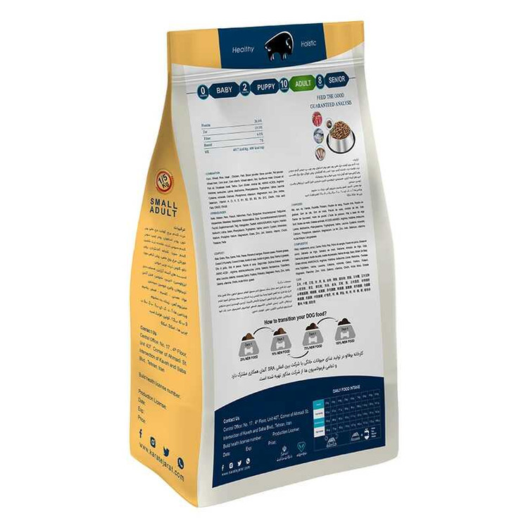 این محصول با همکاری شرکت دانش بنیان SRA آلمان مخصوص سگهای بالغ نژاد کوچک فرموله شده که ترکیب مناسبی از غلات تازه با کیفیت و بدون گلوتن بوده و 65 درصد پروتئین این محصول از پروتئین حیوانی و مابقی از پروتئین گیاهی است همچنین از پودر آب پنیر و مواد معدنی بالانس شده برای بهبود و شادابی پوست و مو و مکمل های محافظ استخوان و مفصل استفاده شده است.